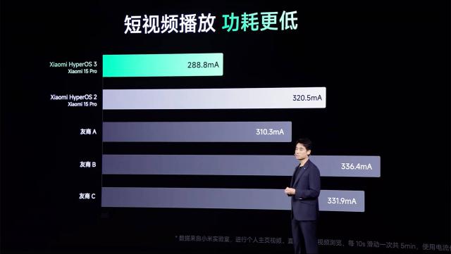虽然每天拿接近一半的屏幕时间刷短视频不太健康,但也的确是很多人的硬性需求。针对这种非常特化的使用场景,澎湃 OS 3 通过微调处理器调度和后台控制,相比 OS 2 可以实现约 30% 的功耗提升:
