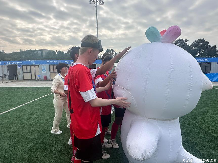 在我套着充气吉祥物外壳时,新疆盲人足球队的运动员们走过来提出想合影。当他们的手掌轻轻覆上吉祥物外壳,口中念叨:“原来这就是喜洋洋和乐融融。”那一刻,我忽然意识到——对他们而言,手便是丈量世界的眼睛。指尖划过的每一寸纹路,都在拼凑着吉祥物的模样,也拼凑着属于他们的欢喜。