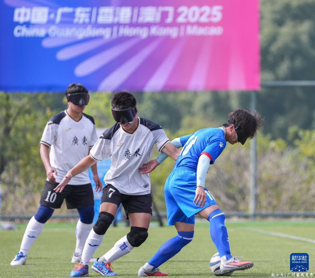 12月11日,全国第十二届残疾人运动会暨第九届特殊奥林匹克运动会盲人足球项目男子组小组赛在广州大学城足球场进行。图为河南队球员黄天缘(右)和广东二团球员柳琦合(中)在比赛中拼抢。最终,广东二团6比0战胜河南队。新华社记者 孙非 摄