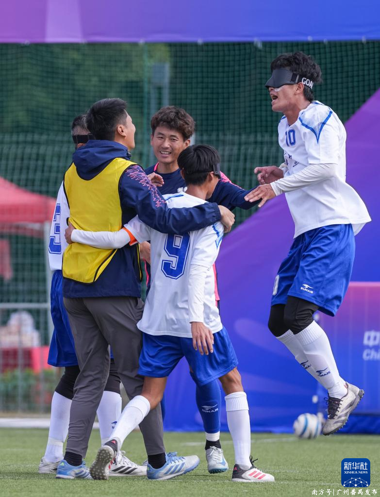 12月11日,全国第十二届残疾人运动会暨第九届特殊奥林匹克运动会盲人足球项目男子组小组赛在广州大学城足球场进行。图为福建队球员在比赛中进球后庆祝。最终,福建队2比1战胜云南队。新华社记者 孙非 摄
