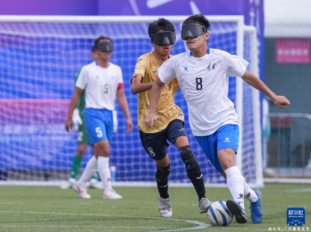 12月10日,全国第十二届残疾人运动会暨第九届特殊奥林匹克运动会盲人足球项目男子组小组赛在广州大学城足球场进行。图为辽宁队球员黄佳俊(右)和广东二队球员谭辉龙在比赛中拼抢。最终,辽宁队3比0战胜广东二队。 新华社记者 孙非 摄