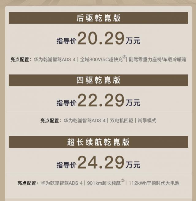 28 日下午发布的新款岚图知音则稍显特别一点——它是首款岚图与华为深度协作并联合调试的纯电车型,新车共提供了三款配置,价格分别为 20.29 万元、22.29 万元、24.29 万元。