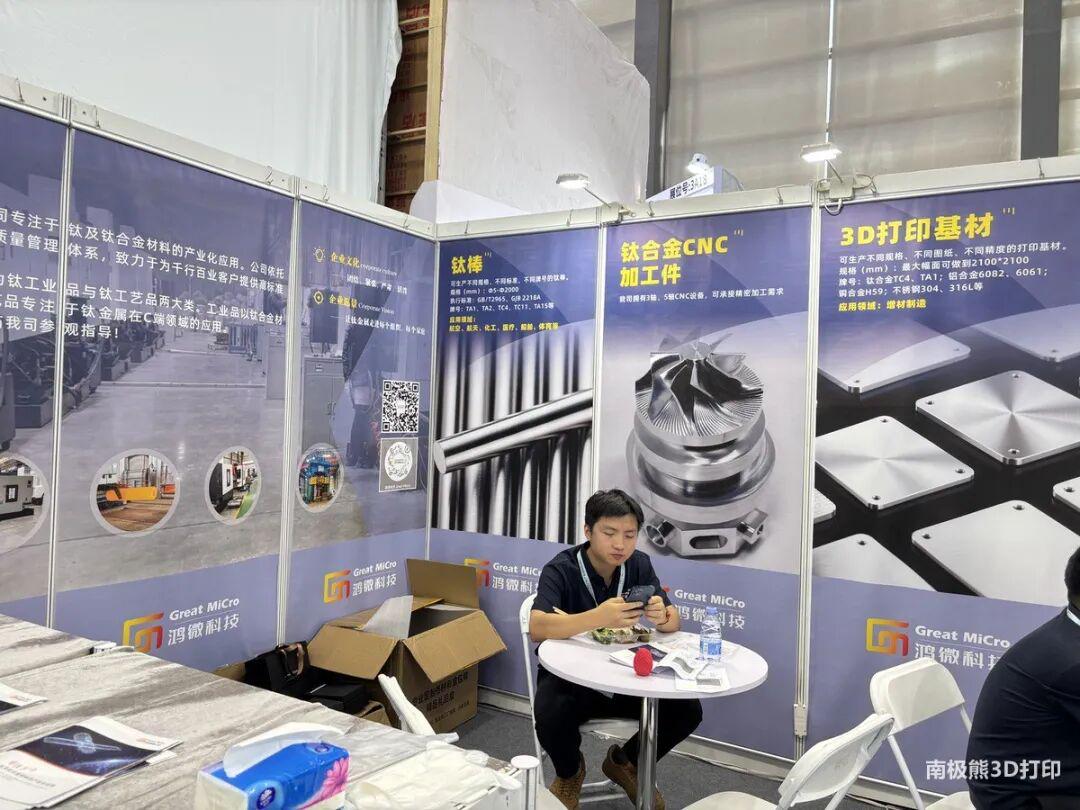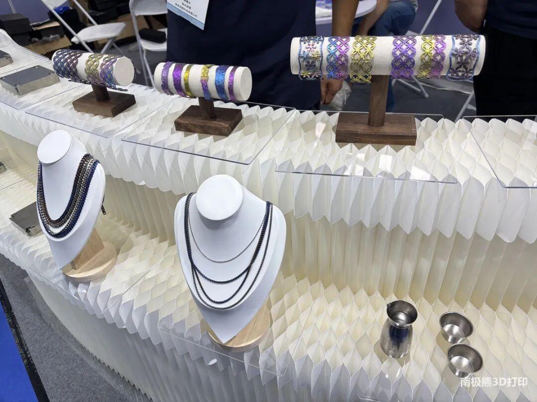 在2025深圳TCT展现场,南极熊遇到了一个略显“非常规”的展商——陕西鸿微科技有限公司。这家成立于2022年的企业,不仅带来传统钛合金打印基板与棒材,更令人眼前一亮的是琳琅满目的钛金属消费品:从项链、手环到钛杯、啤酒杯,甚至整套钛酒具,色彩斑斓地陈列在展位中,吸引大量跨境买家和消费者驻足。